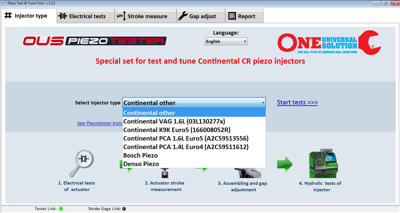 A set of tools for comprehensive electrical and mechanical testing of all types of piezo injectors. Detection of faulty/worn out piezo heads.